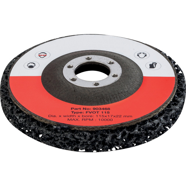 Изработен от синтетични влакна, абразивно зърно и смола. За премахване на тежка корозия, котлен камък върху горещо валцувани стомани, упорити слоеве боя върху метали и топлинно тониране. Идеален за неръждаеми стомани. За метално чисти повърхности.