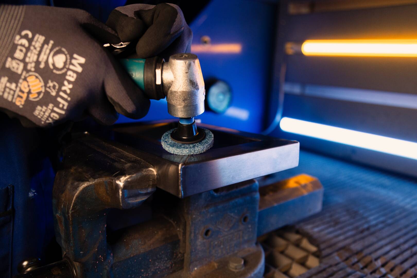 Финишна обработка на леки заваръчни шевове . Шлайфане на заострени заварки, неравности и повреди. Премахване и рафиниране на заваръчни шевове . Премахване и рафиниране на заваръчни пръски . Почистване на мустаци . Финишна обработка на заваръчни шевове . Премахване на линии от фрезоване . Подобряване на грапавостта на повърхността